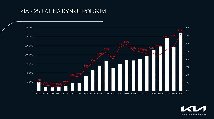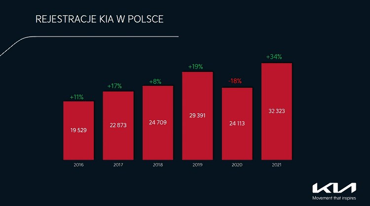 •w 2021 roku zarejestrowano w Polsce w sumie 32.323 samochody osobowe marki Kia, czyli o aż 34% więcej niż w 2020 roku, co przełożyło się na wzrost udziału w rynku do 7,24% w porównaniu z 5,6% w 2020 roku