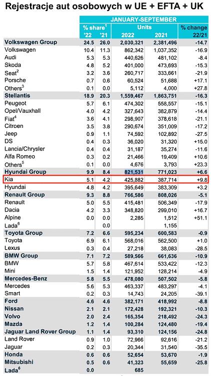 W Grupie Hyundaia wyróżnia się Kia, która poprawiła wynik aż o 9,8 proc. (Hyundai o 3,2 proc.). Od stycznia do września tego roku w krajach Europy (Unia + EFTA + Wielka Brytania) zarejestrowano 425,9 tys. samochodów tej marki – 38 tys. więcej niż przed rokiem. I to wszystko w czasach, gdy brakuje podzespołów do produkcji! Kia w statystykach sprzedaży wyprzedza już nie tylko Forda, Citroena, Opla, czy Skodę. W tym roku udało się jej wjechać również przed Renault. Co więcej, zaczyna wjeżdżać w zderzak takim tuzom, jak Mercedes, BMW oraz Audi. To ostatnie w trzech kwartałach tego roku wydało klientom 440,6 tys. aut – zaledwie 14 tys. więcej niż Kia!