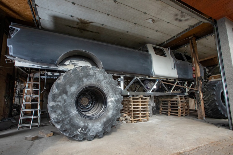 Prace nad dynowskim monster truckiem trwają już od 8 miesięcy. Samochód jest prawie gotowy do oklejenia. Teraz współpracownicy Przemka malują ramy, montują ogromne koła oraz podprowadzają elektronikę.