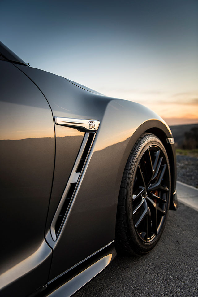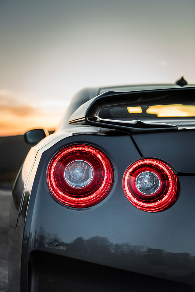Tył nowego GT-R nadal definiują przede wszystkim jego kultowe okrągłe światła, lecz po bliższym przyjrzeniu się uwagę zwracają także wykończony na srebrno dyfuzor oraz nowe boczne wloty powietrza, które zostały umiejscowione obok czterech końcówek tytanowego układu wydechowego w celu poprawienia aerodynamiki pojazdu. Pas oddzielający dolną czarną część od górnej części nadwozia poprowadzono nieco wyżej, dzięki czemu tył samochodu został optycznie poszerzony i zyskał bardziej agresywny wygląd. Tylny zderzak ma teraz taką samą konstrukcję, jak w GT-R NISMO, co zapewnia lepszy przepływ powietrza w dolnej części tyłu pojazdu. Dzięki temu zmniejszono również interferencje zachodzące między gazami spalinowymi wyrzucanymi z rur wydechowych a opływem powietrza wzdłuż tylnych bocznych części zderzaka w celu uzyskania lepszego odprowadzania ciepła. Stylowe felgi firmy RAYS z kutego aluminium z ramionami w kształcie litery Y zostały przeprojektowane, co zaowocowało zmniejszeniem ich masy, poprawą wytrzymałości i sztywności oraz bardziej stabilnym zachowaniem auta podczas jazdy z dużą prędkością.