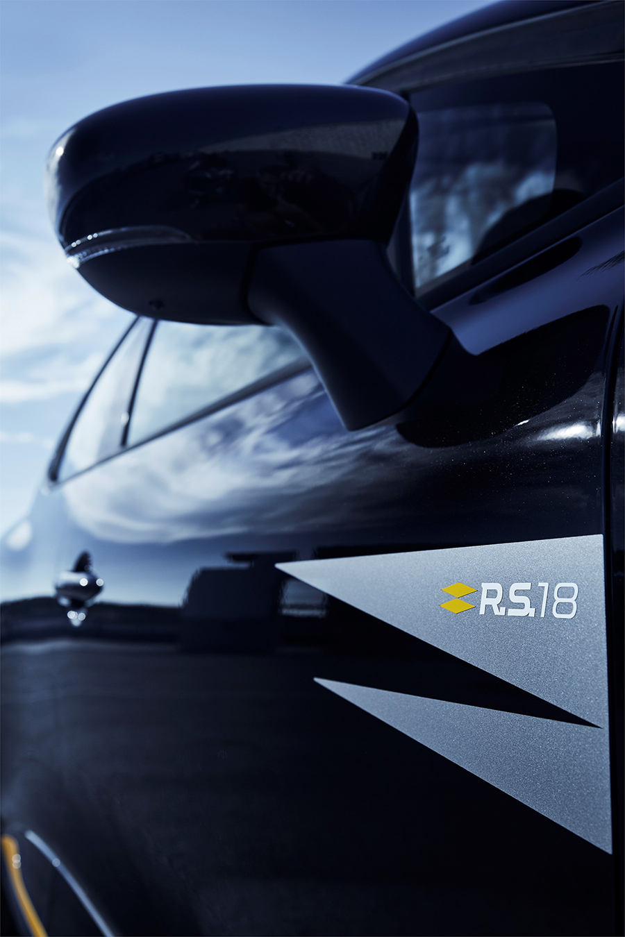 Z ZEWNĄTRZ: naklejki R.S.18 umieszczone na przednich drzwiach oraz naklejka dachowa w barwach Renault Sport – podwójny szary diament i nowe logo R.S. – stanowią bezpośrednie nawiązanie do Renault Sport Formula One Team i jego przyszłego bolidu. Barwne akcenty w kolorze Żółty Sirius, flagowym kolorze Renault Sport, kontrastują z głęboką czernią nadwozia. Kolor Żółty Sirius jest obecny na listwie aerodynamicznej w stylu F1, na listwach ochronnych dolnych krawędzi drzwi i na centralnych nakładkach obręczy kół. Tylne oznakowanie auta jest w całości w kolorze czarnym, podobnie jak logo Marki i znaczek „R.S.” na przednim zderzaku, co tworzy unikalny dla tej serii akcent graficzny. Całkowicie czarny jest także tylny dyfuzor. Powyższe elementy dodają drapieżności wyglądowi auta.