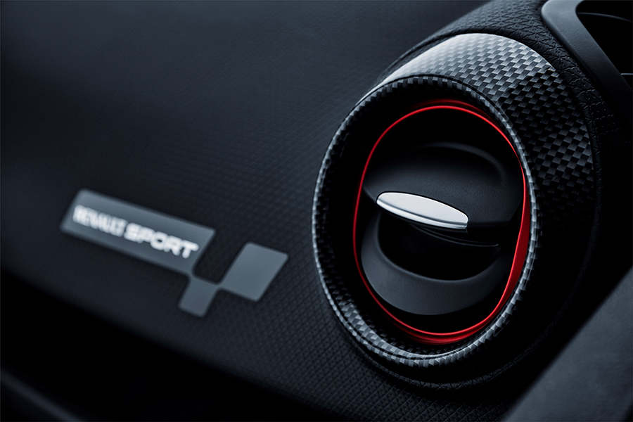 WEWNĄTRZ: wyjątkowy charakter tej limitowanej serii jest widoczny już w chwili wsiadania w postaci numerowanych i opatrzonych znakiem „R.S.” nakładek na progi drzwi. Składa się na niego również obszyta Alcantarą® i skórą kierownica, wizualnie podkreślająca sportowy charakter samochodu. Nawiewy na desce rozdzielczej posiadają obramowanie z karbonowym motywem. Ponadto wersja ta posiada w standardzie firmowe dywaniki podłogowe Renault Sport.