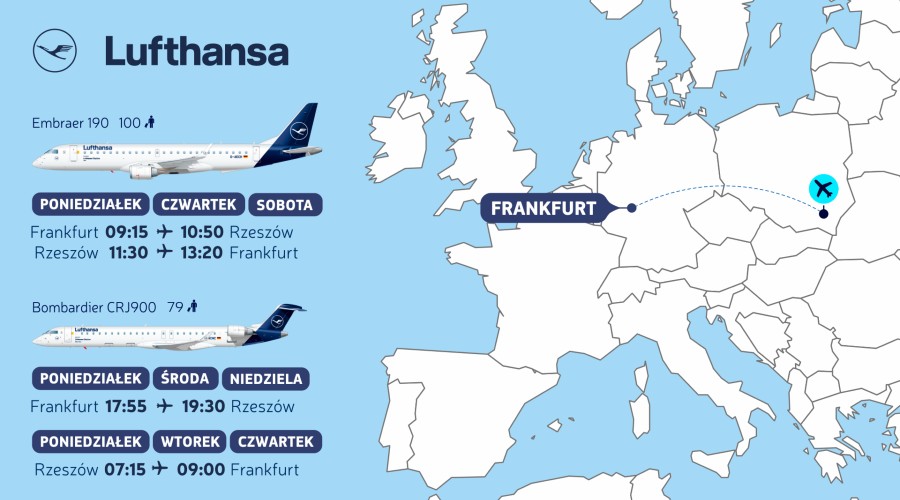 Trasa do Frankfurtu obsługiwana będzie dwoma typami samolotów: Embraer E-190 ze 100 miejscami na pokładzie oraz Bombardier CRJ-900 dysponującym 79 fotelami. Zgodnie z opublikowanym dziś rozkładem wyloty z Rzeszowa zaplanowano dwa razy dziennie w poniedziałek i czwartek (o 7.15 i 11.30) i raz dziennie we wtorek (7.15) i sobotę (11.30). Z kolei loty z Frankfurty będą się odbywać dwa razy dziennie w poniedziałek (9.15 i 17.55) i raz dziennie w środę i niedzielę o 17.55, zaś w czwartek i w sobotę o 9.15.