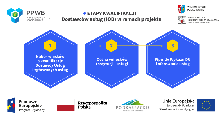 Weryfikacja zgłoszeń IOB obejmuje najpierw ocenę formalną, a następnie ocenę merytoryczną. Kryteria formalne dotyczą między innymi: prawidłowo wypełnionego i złożonego wniosku, kompletnej dokumentacji, prowadzenia działalności przez okres minimum 3 miesięcy przed złożeniem wniosku o kwalifikację DU. Obowiązkowo IOB zgłasza min. 1 usługę, która będzie dostępna za pośrednictwem PPWB.