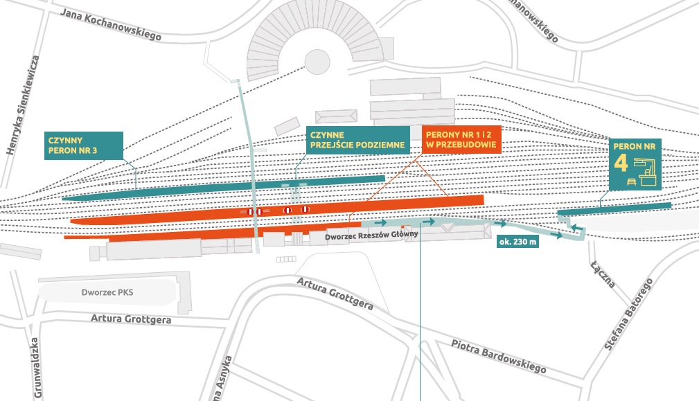 W związku z przebudową centralnej części stacji Rzeszów Główny PKP Polskie Linie Kolejowe wprowadzają zmiany w komunikacji. W Rzeszowie pojawił się dodatkowy, ale tymczasowy peron nr 4, który ma ułatwić podróżnym poruszanie się po obiekcie w trakcie rozpoczętych prac. Zmiany będą obowiązywać do 18 października.