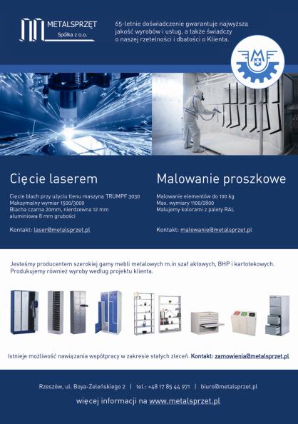 Wycinanie najróżniejszych, często bardzo skomplikowanych kształtów, stało się znacznie prostsze, szybsze, dokładniejsze, a przede wszystkim tańsze od tradycyjnych metod, od kiedy zaczęto w tym celu stosować lasery. Dziś, dzięki najnowocześniejszym rozwiązaniom, ten sposób cięcia metalu, aluminium, miedzi, ale również szkła i plastiku, jest najlepszym rozwiązaniem dla klientów, którzy oczekują krótkich terminów realizacji zamówień, a równocześnie najwyższej jakości usługi. To gwarantuje firma Metalsprzęt Sp. z o.o. z Rzeszowa, która świadczy usługi wycinania laserem przy użyciu niemieckiej wycinarki Trumpf. To obecnie jedno z najlepszych urządzeń tego typu na świecie. TruLaser 3030 jest maszyną nowej generacji, która zapewnia powtarzalność wykonania czynności z niezwykłą precyzją. – Laser pracuje w osłonie tlenu lub azotu i tnie do 20 mm stali czarnej, do 12 mm stali nierdzewnej i do 8 mm aluminium – wyjaśnia Tomasz Krzanowski, konstruktor w firmie Metalsprzęt Sp. z o.o. – Maksymalny format blachy, jaki można użyć w tej maszynie, to 3 metry na 1,5 metra, ale w przypadku większego detalu rozwiązaniem jest możliwość podzielenia go na kilka części. Przy jego użyciu można wyciąć każdy, nawet najbardziej skomplikowany element w formacie 2D. Powstaje gotowy detal, o gładkiej i czystej powierzchni, który nie wymaga już żadnej dodatkowej obórki, żadnego czyszczenia. To znacznie skraca czas pracy, a co za tym idzie również koszty wykonania detalu.