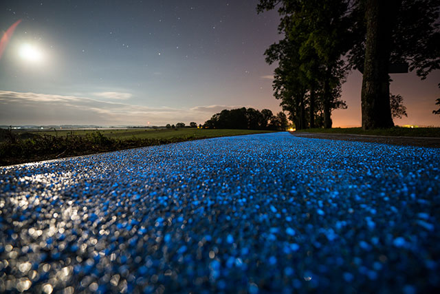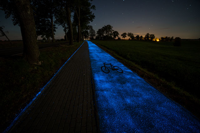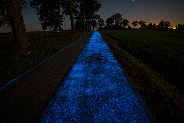 Nawierzchnia świecącej ścieżki rowerowej zawiera tzw. luminofory. To specjalne substancje syntetyczne, które „ładują” się za pomocą światła dziennego, a następnie nocą emitują nagromadzoną energię. Taka ścieżka nie potrzebuje dodatkowego zasilania – jest samowystarczalna i ekologiczna. Poprawia także bezpieczeństwo jazdy rowerzystów i ruchu pieszych po zmroku.
