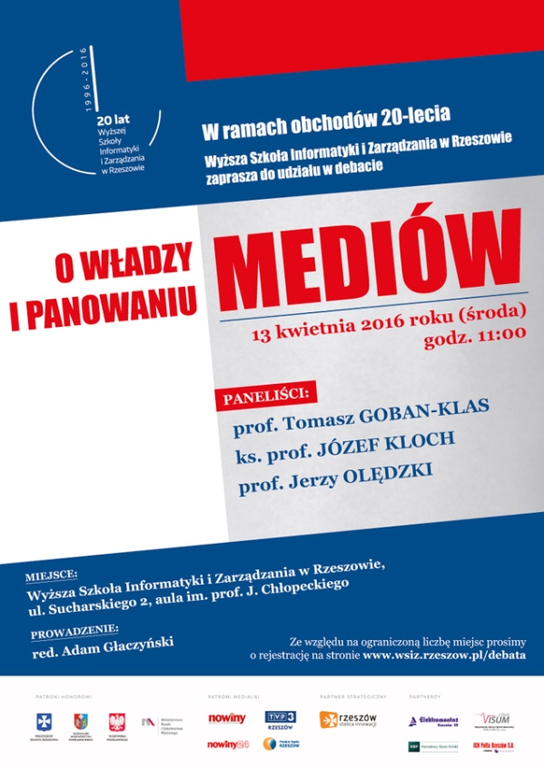 Debata odbywa się w ramach obchodów Jubileuszu 20-lecia Wyższej Szkoła Informatyki i Zarządzania w Rzeszowie. Wydarzenie rozpocznie się 13 kwietnia 2016 roku, (środa), o godzinie 11.00, w auli im. prof. Jerzego Chłopeckiego, w siedzibie WSIiZ, przy ul. Sucharskiego 2 w Rzeszowie.