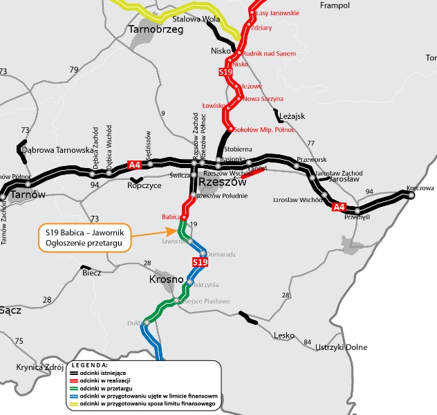 Generalna Dyrekcja Dróg Krajowych i Autostrad zapowiada kolejny przetarg na odcinek S19 na południe od Rzeszowa. Wkrótce ukaże się ogłoszenie o przetargu na zaprojektowanie i budowę odcinka drogi ekspresowej S19 Babica - Jawornik.