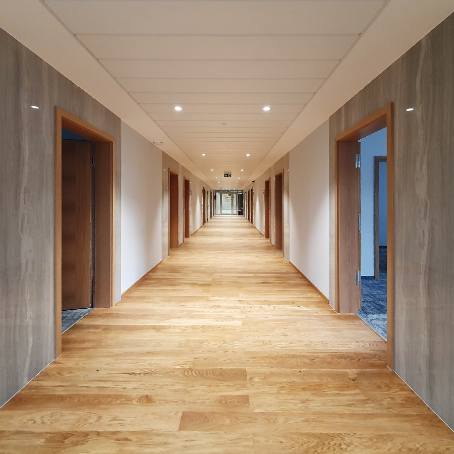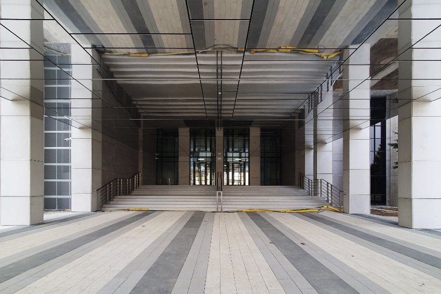 Powiększono również drugą, małą salę audytoryjną. Drewniane wykończenia podłóg i drzwi ociepliły korytarze części administracyjnej, w której mieści się sala senatu - usytuowana nad strefą wyjściową i wsparta filarami.