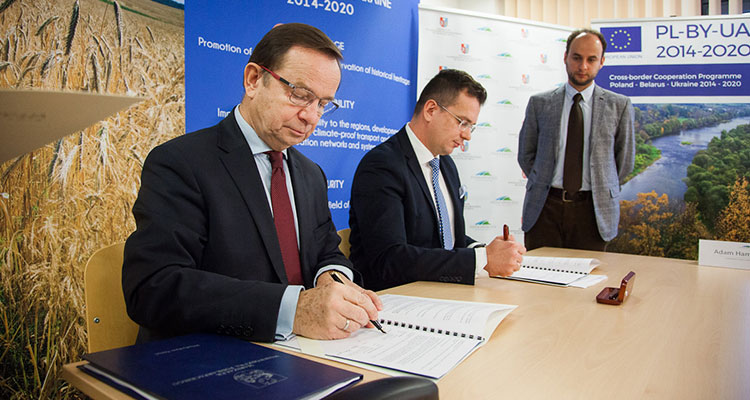 Od lewej: marszałek Władysław Ortyl i wiceminister Adam Hamryszczak podpisują umowę o powstaniu Oddziału Programu Współpracy Transgranicznej Polska-Białoruś-Ukraina 2014-2020. Fot. UMWP