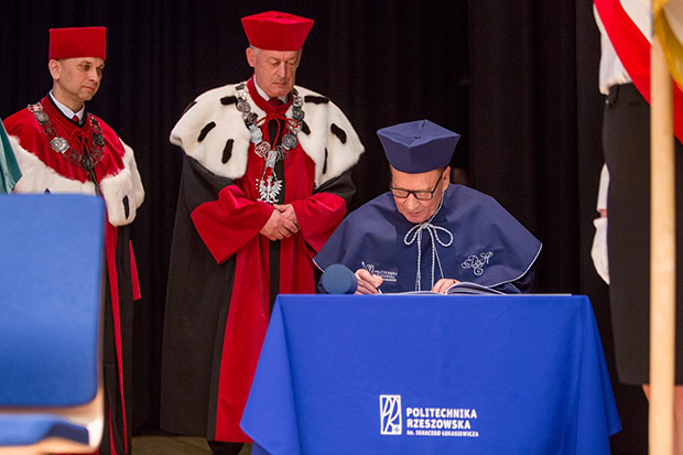 - Trema jest maksymalna – powiedział prezydent Rzeszowa odbierając godność doktora honoris causa Politechniki Rzeszowskiej. Tadeusz Ferenc jest 11 osobą, która otrzymała ten tytuł przyznawany przez politechnikę. Wręczenie odbyło się w piątek, 19 maja podczas posiedzenia senatu uczelni, a wśród gości znaleźli się m.in. Leszek Miller, Grzegorz Schetyna, Janusz Piechociński, Paweł Kowal, podkarpaccy posłowie, rektorzy tutejszych uczelni, rektorzy z uczelni innych miast, a także przedstawiciele służb mundurowych, Kościoła i biznesu - łącznie ponad 400 osób.