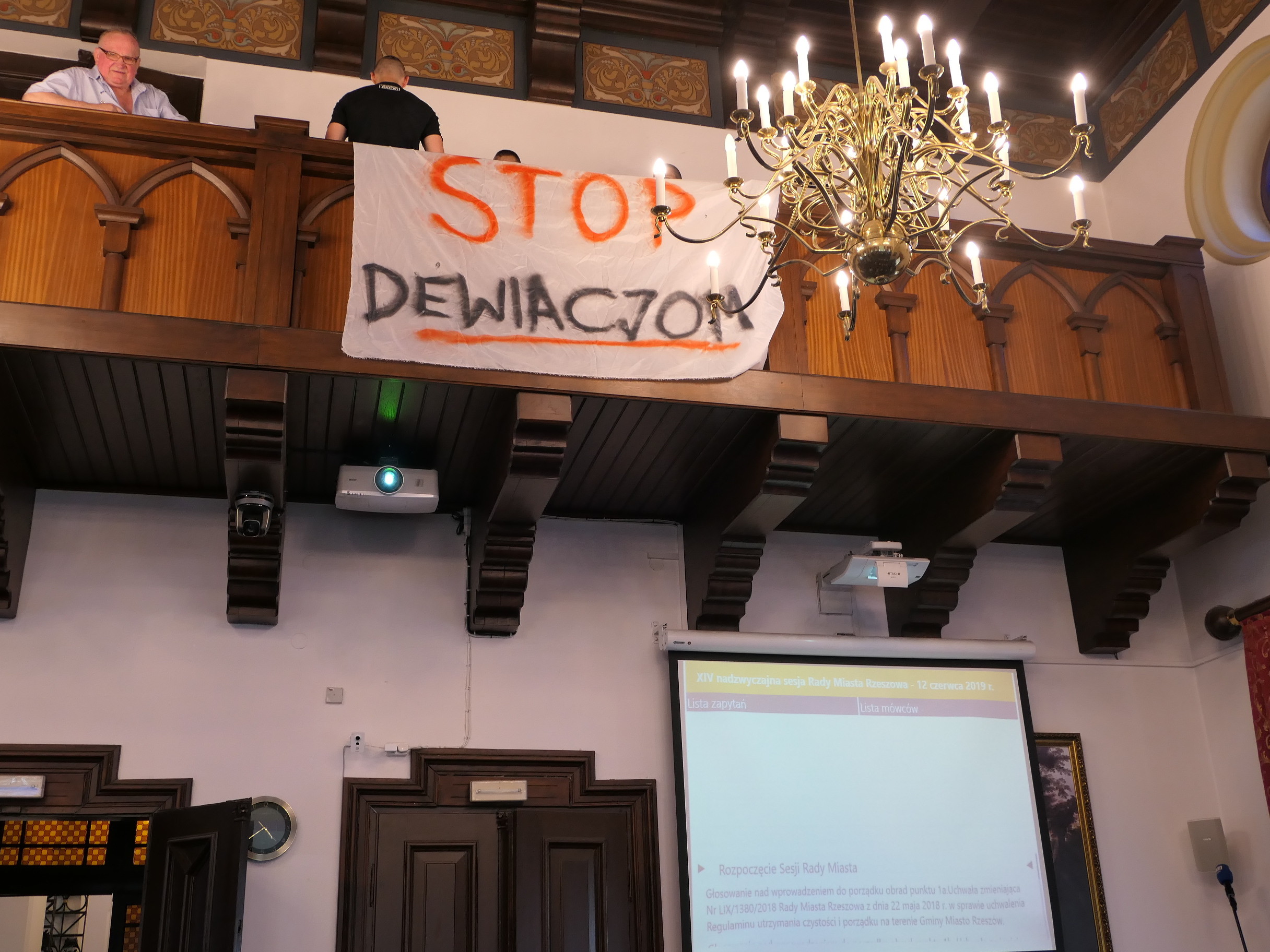 Atmosferę obrad podgrzewała obecność Młodzieży Wszechpolskiej, która na balkonie sali sesyjnej rozwiesiła transparent z napisem: „Stop Dewiacjom” oraz Ruchu Narodowego i partii Razem.  W trakcie posiedzenia Rady, jednego z protestujących przeciwko LGBT z sali obrad wyprowadziła Straż Miejska.