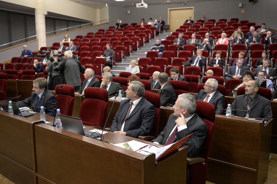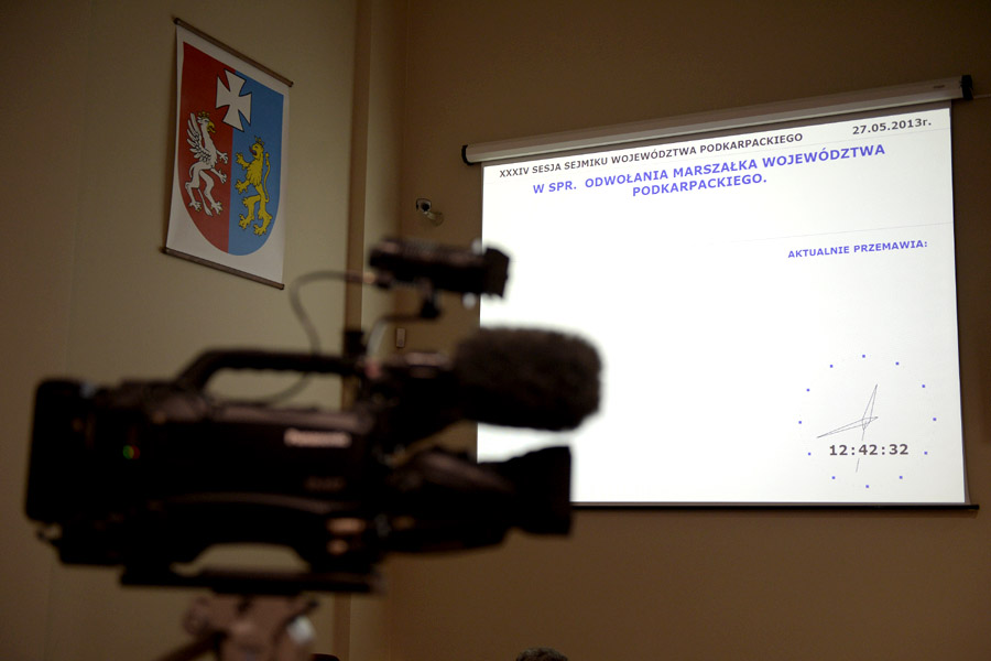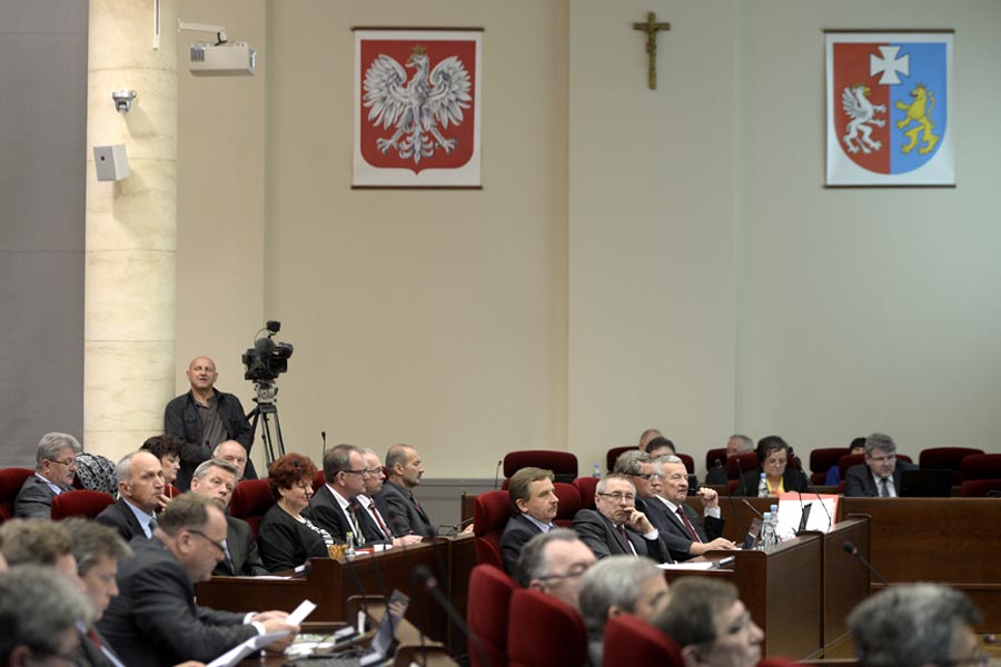 Sesję z miejsc dla publiczności obserwowali „ojcowie” dotychczasowej koalicji: Jan Bury (PSL), Zbigniew Rynasiewicz (PO) i Tomasz Kamiński (SLD), jak również grupa parlamentarzystów PiS, z senatorem Władysławem Ortylem na czele.Zanim jednak wybrano nowego marszałka i zarząd województwa, odwołano z funkcji marszałka Mirosława Karapytę. Dotychczasowego marszałka, który jest także radnym, a któremu prokuratura postawiła zarzuty korupcyjne, nie było na sesji. Za odwołaniem Karapyty zagłosowało 31 radnych, jeden głos był nieważny. W kuluarach