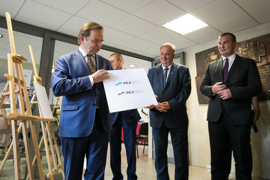 Marszałek Władysław Ortyl po raz pierwszy zaprezentował logo Podkarpackiej Kolei Aglomeracyjnej. Fot. Michał Mielniczuk