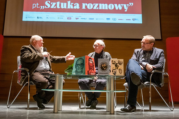 - Kiedy wiemy, że mamy rozmawiać i jeszcze mam dbać o to, żeby dobrze rozmawiać, to ta rozmowa traci to, co jest dla niej bardzo ważne - naturalność, spontaniczność. Przeżywamy pewien stres. Trzeba od czegoś zacząć, a rozmowa ma być swobodna. Ten chaos rozmowy dobrze oddał Adam Mickiewicz opisując spotkanie Wojskiego z Tadeuszem: „Zaczęła się ta prędka, zmieszana rozmowa,/ W której lat kilku dzieje chciano zamknąć w słowa/ Krótkie i poplątane, w ciąg powieści, pytań,/ Wykrzykników i westchnień, i nowych powitań.” Taka właśnie rozmowa powinna być - spontaniczna, sprawiająca radość. To w końcu nasze najbardziej naturalne bycie z ludźmi, a bycie z ludźmi jest naszym naturalnym byciem w ogóle - zwrócił uwagę publiczności już na wstępie spotkania prof. Jerzy Bralczyk. Słynny językoznawca sypał cytatami klasycznych dzieł, skrzył dowcipem i sypał anegdotami, dając doskonały przykład zgrabnego mówienia i budząc nieśmiałość umiejętnością słownej szermierki. Rozmówców miał jednak godnych - red. Michała Ogórka, dziennikarza i satyryka, z którym już niejedną wspólną książkę „popełnił” (np. „Kiełbasa i sznurek”, „Na drugie Stanisław. Nowa księga imion”), oraz prowadzącego spotkanie Wojciecha Bonowicza, dziennikarza i poetę, finalistę Nagrody Literackiej Nike 2018.