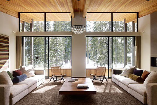 Elementem niezbędnym w nowoczesnym, choć często wybudowanym w tradycyjnym stylu, jest duże okno lub przeszklenie całej ściany w salonie. Dawniej unikano wkomponowywania zbyt dużych okien, ponieważ w górskim klimacie byłoby to absurdalnym pomysłem, gdyż przeszklone przestrzenie to zawsze największa strata ciepła. Jednak współczesne technologie pozwalają na tworzenie nawet całych szklanych ścian, ponieważ okazuje się, że nowoczesne okna nie tylko nie wpuszczają zimna do wnętrza domu, ale pochłaniają światło słoneczne, które jest wykorzystywane do ogrzewania domu. Nadmiar energii jest gromadzony, zazwyczaj pod odpowiednio izolowanym dachem. Wykonane w nowoczesny sposób przeszklenia pełnią nie tylko funkcję praktyczną, ale również estetyczną, ponieważ dzięki nim mieszkańcy mogą przez cały rok podziwiać zmieniający się pejzaż gór.