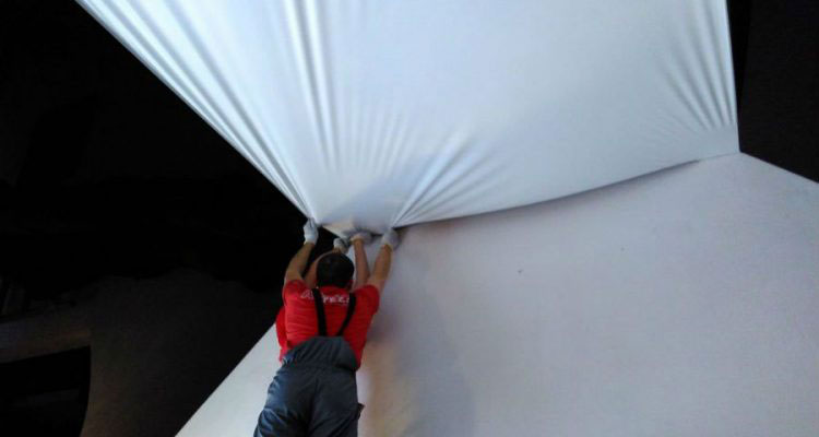 Pod wpływem wysokiej temperatury materiał sufitu zwiększa swoją objętość, a wtedy można go łatwo wpiąć w aluminiowe listwy ścienne. Należy jednak uważać, aby go nie uszkodzić, dlatego do wpinania foli w listwy, używa się specjalnie wyprofilowanego narzędzia. Po napięciu całego sufitu, w szczeliny powstałe między ścianą a sufitem wciska się plastikowe listwy maskujące. Zapobiegają one dostaniu się insektów i kurzu do przestrzeni między sufitem a stropem.