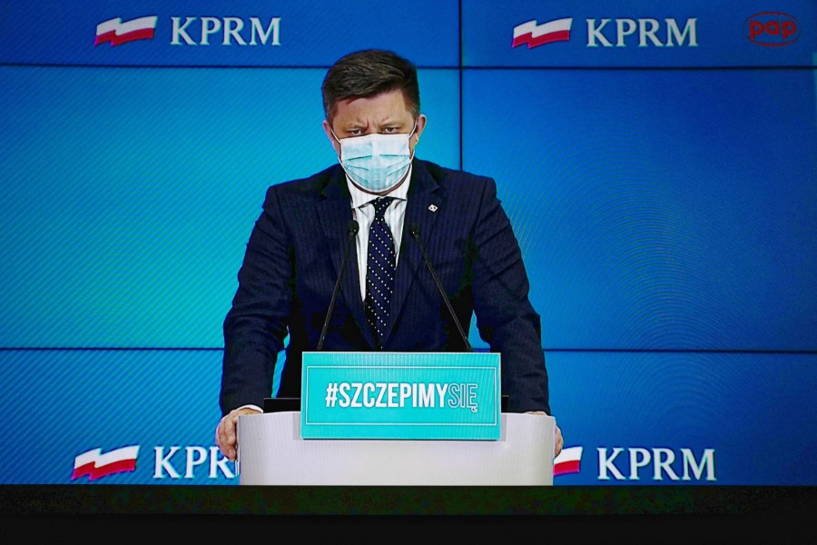 Minister-członek Rady Ministrów, szef KPRM Michał Dworczyk podczas konferencji prasowej transmitowanej z siedziby KPRM. Fot. Mateusz Marek/PAP