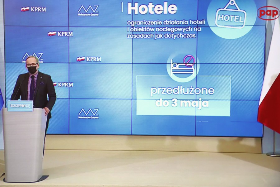 Minister zdrowia Adam Niedzielski podczas konferencji prasowej, transmitowanej z siedziby KPRM i oglądanej w jednym z mieszkań w Warszawie. Fot. Leszek Szymański/PAP