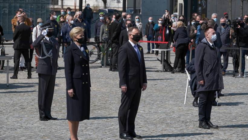 Prezydent Andrzej Duda wraz z małżonką Agatą Kornhauser-Dudą podczas uroczystości złożenia kwiatów przed Pomnikiem Bohaterów Getta na stołecznym Muranowie. Fot. Mateusz Marek/PAP