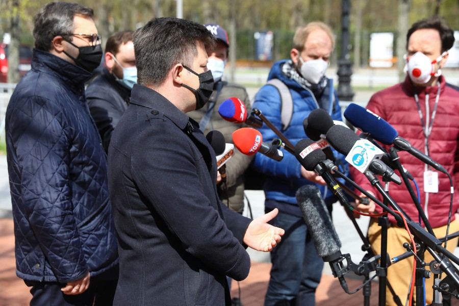 Szef KPRM Michał Dworczyk oraz prezes Rządowej Agencji Rezerw Strategicznych Michał Kuczmierowski podczas briefingu prasowego przed siedzibą KPRM w Warszawie. Fot. Rafał Guz/PAP