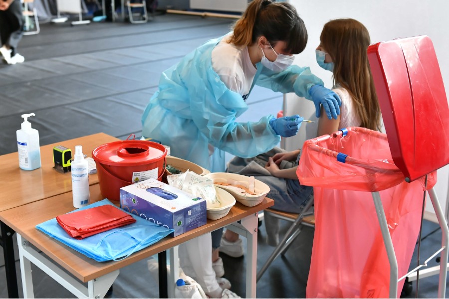 Punkt szczepień przeciw COVID-19 dla wrocławskich uczniów w V LO we Wrocławiu, 1 bm. Fot. Maciej Kulczyński/PAP
