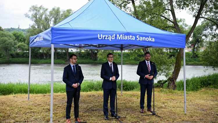 Premier Mateusz Morawiecki, burmistrz Sanoka Tomasz Matuszewski oraz poseł do Parlamentu Europejskiego Tomasz Poręba. Fot. Darek Delmanowicz/PAP