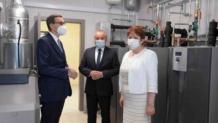 Premier Mateusz Morawiecki oraz wójt Gminy Budziszewice Marian Holak i dyrektor szkoły Bożena Jarecka. Fot. Grzegorz Michałowski/PAP