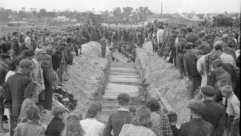 Kielce, 1946-07-08. Pogrzeb ofiar pogromu kieleckiego. Bezpośrednią przyczyną wybuchu agresji w stosunku do ludności żydowskiej w mieście była plotka o rzekomym uwięzieniu przez Żydów w piwnicy budynku przy ulicy Planty 7 ośmioletniego chłopca, Henryka Błaszczyka w celu dokonania na nim mordu rytualnego. W czasie pogromu śmierć od pobicia albo postrzału poniosło 40 Żydów i 2 Polaków. Fot. PAP