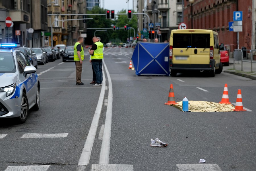 Służby na miejscu śmiertelnego wypadku u zbiegu ulic Mickiewicza i Stawowej w ścisłym centrum Katowic, 31 bm. Fot. Hanna Bardo/PAP