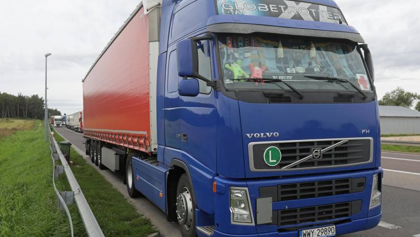 Bobrowniki (woj. podlaskie), 24.08.2021. Ciężarówka z polską pomocą humanitarną przeznaczoną dla uchodźców na Białorusi przed przejściem granicznym w Bobrownikach, 24 bm. Aby transport mógł przekroczyć granicę potrzebna jest zgoda władz białoruskich. Fot. PAP/Artur Reszko