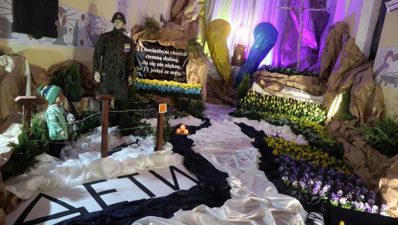 W Sanktuarium Matki Bożej Księżnej Sieradzkiej w Charłupi Małej (Łódzkie) wystrój Grobu Pańskiego, którego nawiązuje do moskiewskiej inwazji na Ukrainę: rosyjski żołnierz celuje w dziecko. „Nie można bezczynnie patrzeć na ból i cierpienie, którego doświadczają nasi sąsiedzi. Zwłaszcza ukraińskie dzieci, które cierpią najbardziej” – podkreślił Dawid Zawiasa, który zaprojektował tegoroczny Grób Pański w Charłupi Małej k. Sieradza.
