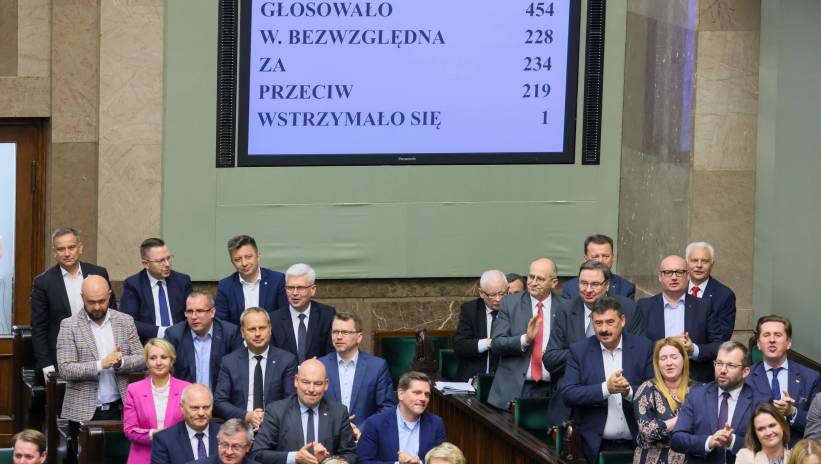 Przed głosowaniem głos zabrał szef klubu KO Borys Budka. "Warto powitać byłego przewodniczącego Rady Europejskiej, przewodniczącego Donalda Tuska" - powiedział Budka nawiązując do obecności lidera PO na sejmowej galerii dla publiczności. Posłowie KO skandowali wtedy: "Donald Tusk, Donald Tusk".