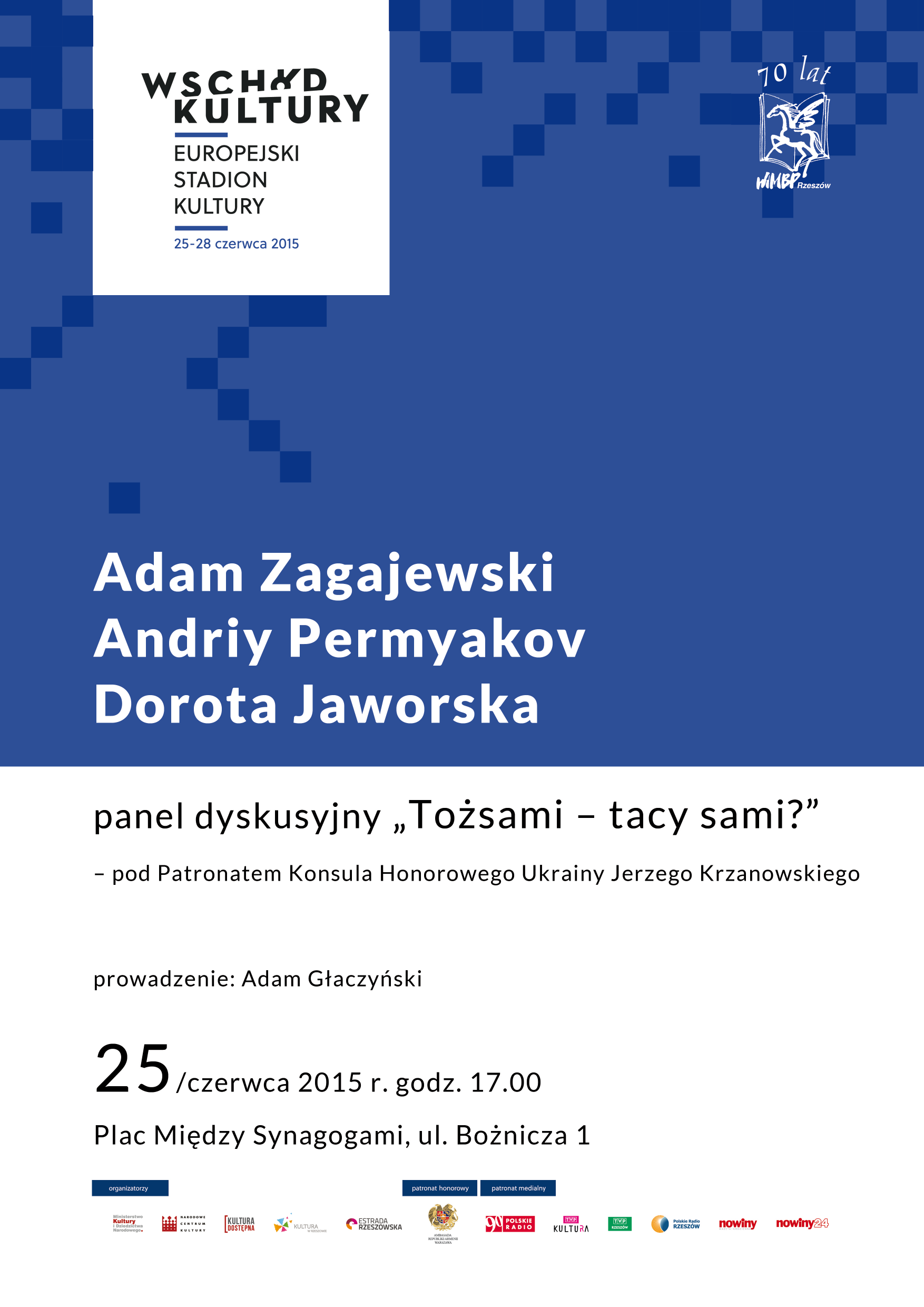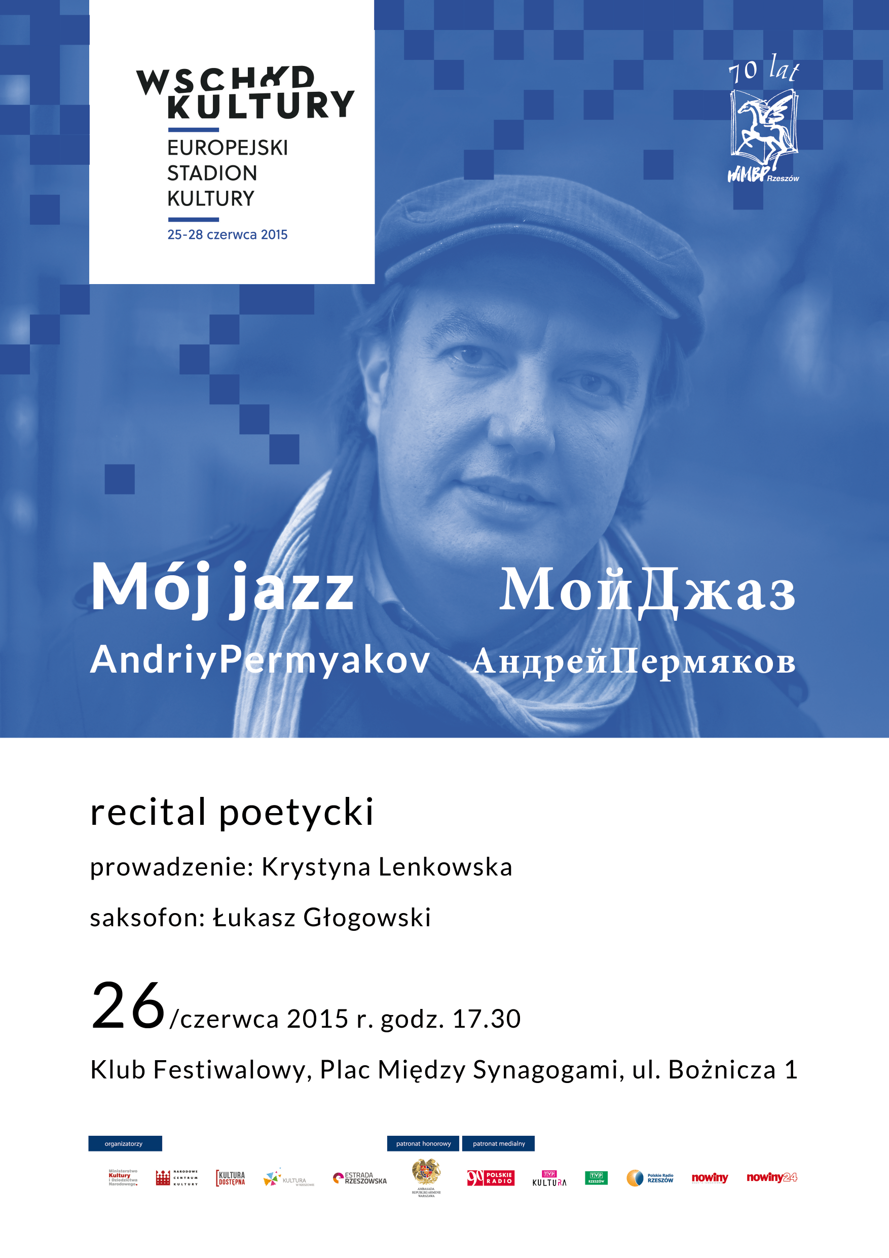 Dzień wcześniej, 25 czerwca, w tym samym miejscu, o godz.17.00, Andrey Permyakov weźmie udział w panelu dyskusyjnym „Tożsami – tacy sami?” razem z wybitnym polskim poetą, Adamem Zagajewskim i dziennikarką polonijną z Kijowa, poetką, Dorotą Jaworską
