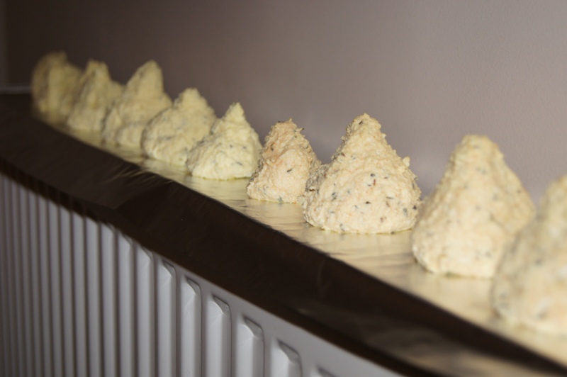 Najistotniejszy w procesie tworzenia gomółek jest następnie sposób ich suszenia. Należy je bowiem przez kilka dni podsuszać. Najlepiej w cieple, ale temperatura nie może być za wysoka. Ja położyłam na folii aluminiowej na kaloryferach. Inny sposób to podsuszać je w piekarniku ale na początek w temperaturze ok 400C najpierw przez 2 godziny, potem zrobić przerwę i znów podsuszyć ze 2 godziny. Kolejnego dnia powtórzyć proces. Generalnie gomółki się obsuszają, kurczą, a skórka twardnieje.