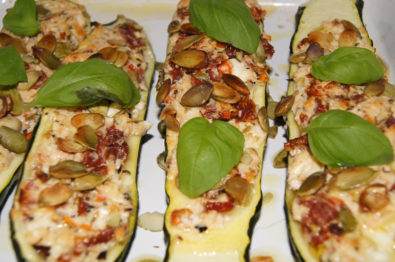Ser nakładamy na wydrążone miejsca w cukini, posypujemy pestkami z dyni i polewamy delikatnie oliwą z oliwek.