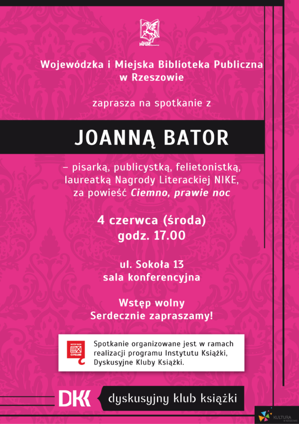 W środę, 4 czerwca o godz. 17 w Wojewódzkiej i Miejskiej Bibliotece Publicznej w Rzeszowie będzie można się spotkać z Joanną Bator, autorką powieści „Ciemno, prawie noc”, za którą otrzymała nagrodę NIKE 2013. Spotkanie w ramach Dyskusyjnego Klubu Książki odbędzie się w sali konferencyjnej WiMBP. Wstęp wolny.