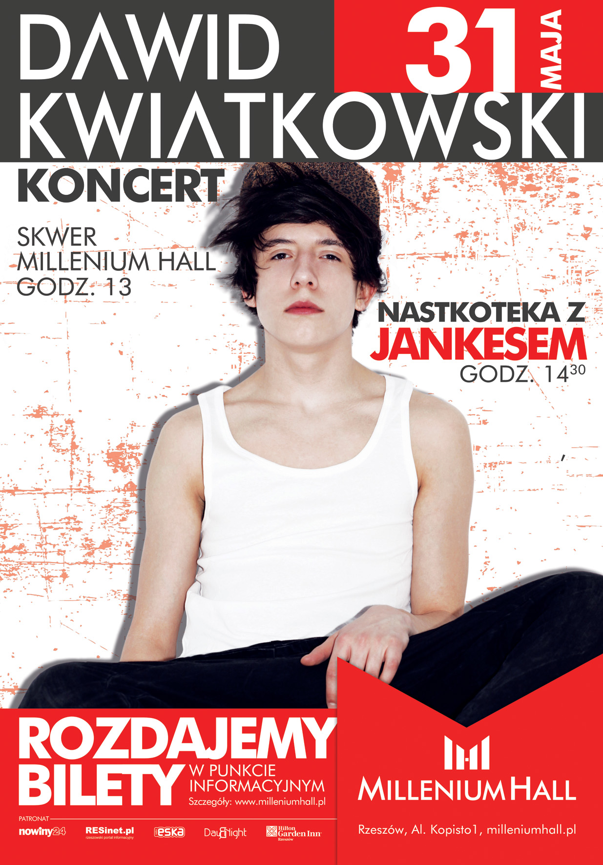 31 maja (sobota) odbędzie się koncert Dawida Kwiatkowskiego w Millenium Hall (Skwer) o godzinie 13. Trwa też konkurs na dla największych fanek Dawida. Specjalną niespodzianką będzie wyjątkowe spotkanie dla 10 osób, które wykażą się wiedzą i kreatywnością podczas odpowiadania na konkursowe pytania: