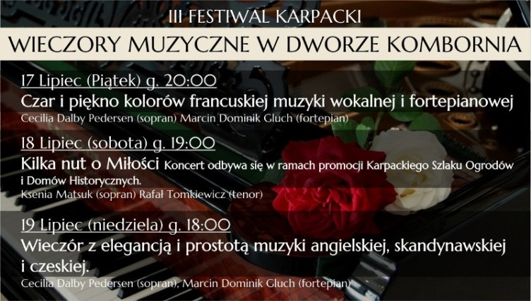 Tegoroczna edycja Festiwalu Karpackiego Wieczory Muzyczne w Dworze Kombornia odbędzie się w dniach 17-19 lipca. Podczas imprezy wystąpią światowej sławy sopranistki Cecilia Dalby Pedersen i Ksenia Matsuk, tenor Rafał Tomkiewicz oraz grający na fortepianie Marcin Dominik Głuch. Finałowy koncert zaplanowano na sierpień.