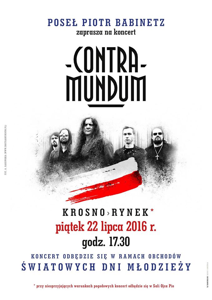 22 lipca (w piątek), o godz. 17.30, na Rynku w Krośnie zagra warszawska grupa rockowa Contra Mundum. Koncert odbędzie się w ramach obchodów Światowych Dni Młodzieży. Przy niesprzyjających warunkach pogodowych występ zostanie przeniesiony do Sali Ojca Pio u krośnieńskich kapucynów.