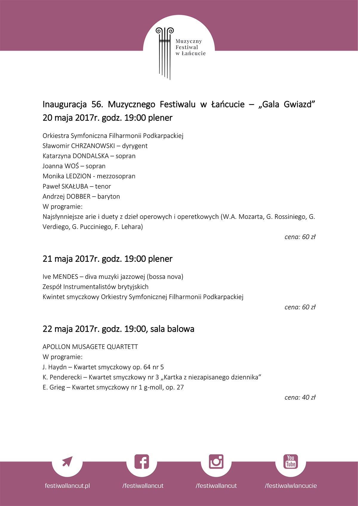 100 dni przed rozpoczęciem festiwalu Filharmonia Podkarpacka im. Artura Malawskiego w Rzeszowie, główny organizator imprezy, zaprezentowała tego najważniejszego muzycznego wydarzenia na Podkarpaciu i uruchomiła sprzedaż biletów. 56. edycja Muzycznego Festiwalu w Łańcucie potrwa 9 dni. Od 20 do 28 maja publiczność będzie miała okazję wysłuchać dziewięciu koncertów w wykonaniu znakomitych muzyków, łączące różne formy i style muzyczne. Dwa pierwsze to koncerty plenerowe na scenie ustawionej przed frontem Zamku w Łańcucie. Kolejne zaplanowano w zamkowej Sali Balowej i dwa w rzeszowskiej filharmonii. Ostatni, tzw. na bis – w Hotelu Sokół w Łańcucie.