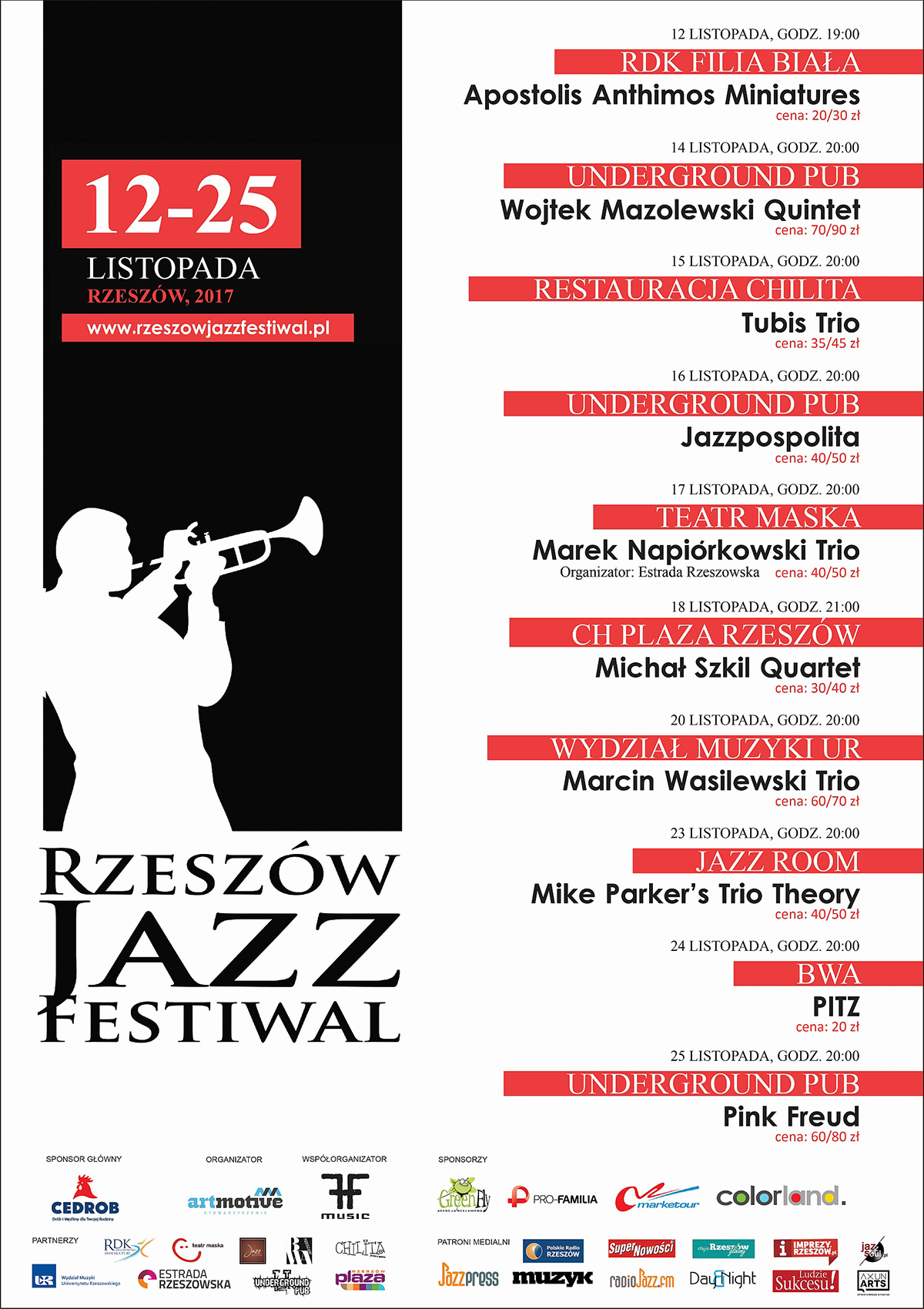 W tym toku do Rzeszowa przyjadą gwiazdy polskiej sceny jazzowej, m.in. Apostolis Anthymos, Marcin Wasilewski, Marek Napiórkowski czy Wojtek Mazolewski w dwóch koncertowych wcieleniach, ale też przedstawiciele młodszego pokolenia szturmem zdobywającego scenę: Jazzpospolita, Mike Parker`s Trio Theory czy Tubis Trio. Zaprezentują się także twórcy na co dzień mieszkający i tworzący w Rzeszowie. Tym razem będą to: Michał Szkil ze swoim znakomitym kwartetem, a także awangardowa formacja PITZ.