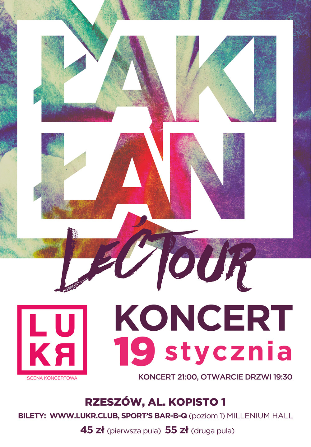 BILETY: 45 zł (pula 1); 55 zł (pula 2) dostępne: Sport's B-B-Q (poziom 1 Millenium Hall) oraz na stronie: www.lukr.club. Rezerwacje miejsc siedzących: www.lukr.club/rezerwacje*decyduje kolejność - ilość miejsc siedzących ograniczona.