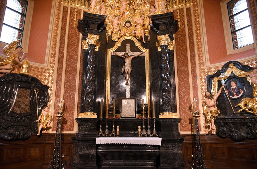 W ołtarzu na ramionach Krzyża rozpięta jest postać umęczonego Zbawiciela z twarzą zastygłą w cierpieniu. Krucyfiks powstał w XVI stuleciu. Umieszczony pierwotnie w kruchcie zachodniej cieszył się sławą cudownego i przyciągał rzesze wiernych. To dla wyeksponowania tego krucyfiksu wzniesiona została opisywana kaplica. U stóp Ukrzyżowanego eksponowane jest dzieło o równie wysokim poziomie artystycznym. To rzeźbiona w alabastrze Pieta z XVII w. sprowadzona z Niderlandów.