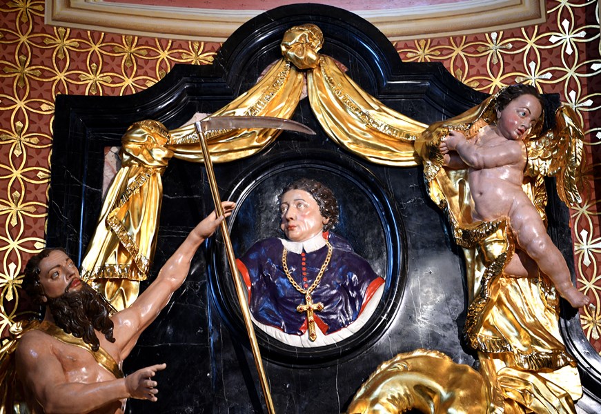 Marmurowy nagrobek biskupa Fredry składa się z dwóch części rozmieszczonych po obu stronach ołtarza. Po stronie lewej (od patrzącego) anioł odsłania kotarę kryjącą kartusz z tablicą inskrypcyjną. Wymienia ona tytuły i zasługi biskupa. Po stronie prawej umieszczono owalny wizerunek biskupa Fredry (płaskorzeźba polichromowana). Zmarłemu towarzyszy Chronos z kosą oraz padający na kolana jednorożec z herbu Bończa.