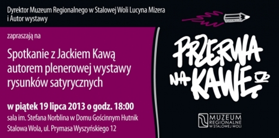W piątek ( 19 lipca) o godz. 18 w sali im. Stefana Norblina w Domu Gościnnym Hutnik w Stalowej Woli spotkanie z Jackiem Kawą, autorem plenerowej wystawy rysunków satyrycznych. Spotkanie, które nomen omen można potraktować jako kulturalną przerwę przy kawie, jest bezpłatne. Zaproszenia można otrzymać w Muzeum Regionalnym w Stalowej Woli, ul. Sandomierska 1, w godzinach pracy Muzeum; tel. 15 842 00 42. Liczba miejsc ograniczona.