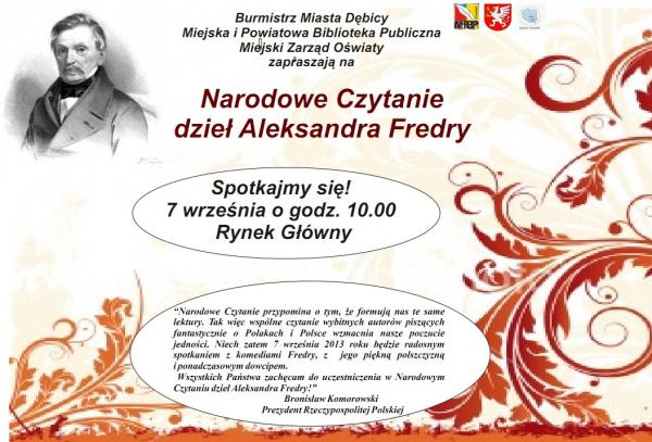 Utwory Aleksandra Fredry czytane będą w godz. 10.00-13.00 w Miejskiej Bibliotece Publicznej oraz na Rynku przed ratuszem. Dla dzieci zostanie przygotowany kącik plastyczny i kolorowanki z bajkowymi postaciami. Czytaniu towarzyszyć będą konkursy, rebusy i quizy w oparciu o znane cytaty, tytuły i postaci dzieł literackich Aleksandra Fredry. Na tle stylowej scenografii pojawią się harcerze ubrani w stroje z epoki, którzy przedstawią epizody sceniczne. Czytającym oraz najwytrwalszym uczestnikom zostaną wręczone upominki i nagrody. Na koniec wspólne wyrecytowany zostanie wiersz „Paweł i Gaweł”, a w budynku biblioteki będzie można obejrzeć wystawę „Humorzasty pan hrabia Fredro”.