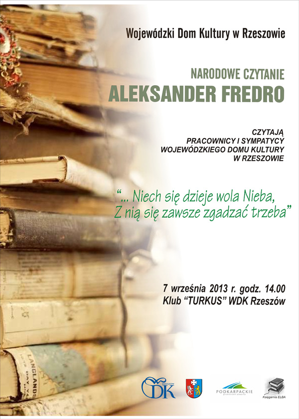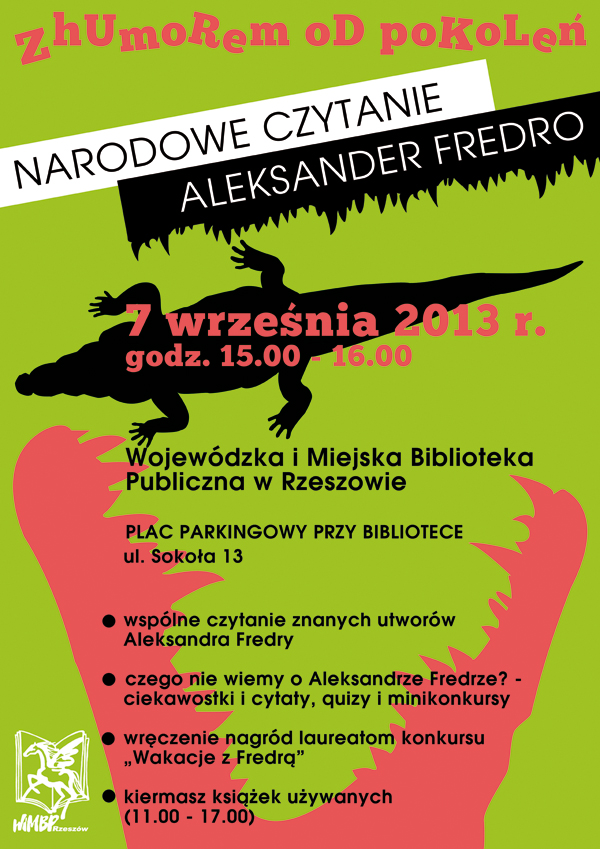 Wojewódzka i Miejska Biblioteka Publiczna zaprasza na parking przy ul. Sokoła 13, gdzie w godz. 15.00-16.00 odbędzie się wspólne czytanie fragmentów najbardziej znanych wierszy i komedii A. Fredry. Uczestnicy akcji dostaną gotowe teksty, mile widziane będą dzieła Fredry z domowej biblioteki. Czytaniu towarzyszyć będą liczne atrakcje m.in. rodzinne quizy i minikonkursy z nagrodami. Nie zabraknie ciekawostek z życia A. Fredry oraz cytatów. Propozycją dla najmłodszych będą animacje, warsztaty plastyczne, gry oraz zdjęcia z ciekawymi fredrowskimi postaciami. W godz. 11.00-17.00  - będzie odbywać się kiermasz książek używanych.