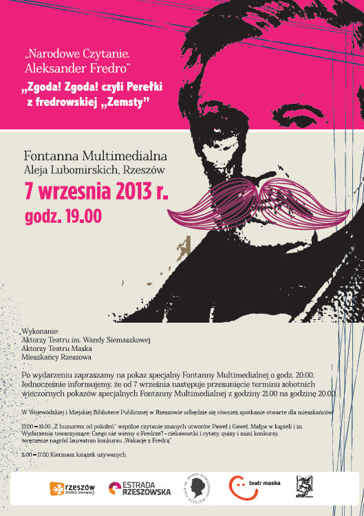 Przy Fontannie Multimedialnej przy al. Lubomirskich o godz. 19.00 dzieła Fredry zaprezentują rzeszowskie teatry: Teatr im. Wandy Siemaszkowej oraz Teatr Maska. Odbędzie się happening pn.: „Zgoda! Zgoda! czyli Perełki z fredrowskiej „Zemsty”. Wydarzenie łączy czytanie fragmentów komedii „Zemsta” z odgrywaniem kilku wybranych scen z udziałem czterech jej bohaterów. Akcja rozegra się w przestrzeni Fontanny Multimedialnej przy alei Pod Kasztanami w Rzeszowie. A dodatkowym elementem urozmaicającym przebieg spotkania będzie pojawianie się postaci pisarza na specjalnym ekranie wodnym stanowiącym ekran dla efektów video.